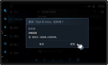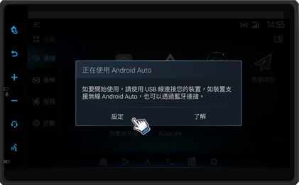觸發無線 Android Auto 藍牙連線時,車機跳出「正在使用 Android Auto 」對話框 → 點選「設定」→ 設定 / 行動連線 / 配對藍牙裝置 → 點選「 欲連線 Android 手機」→ 車機跳出「配對」對話框→點選「配對」